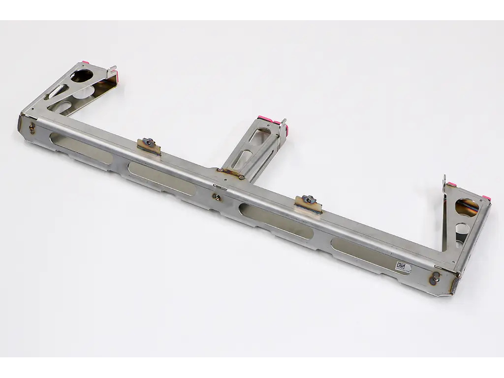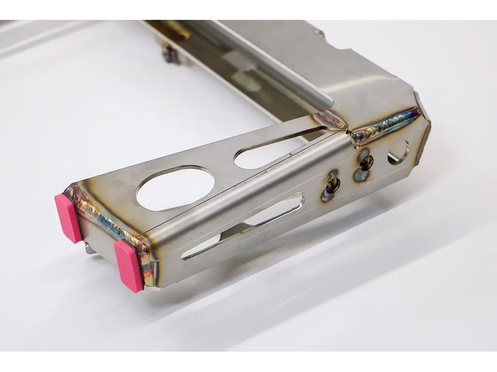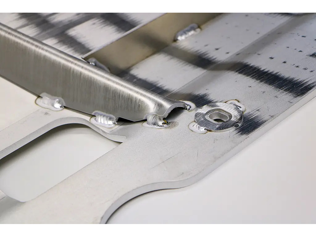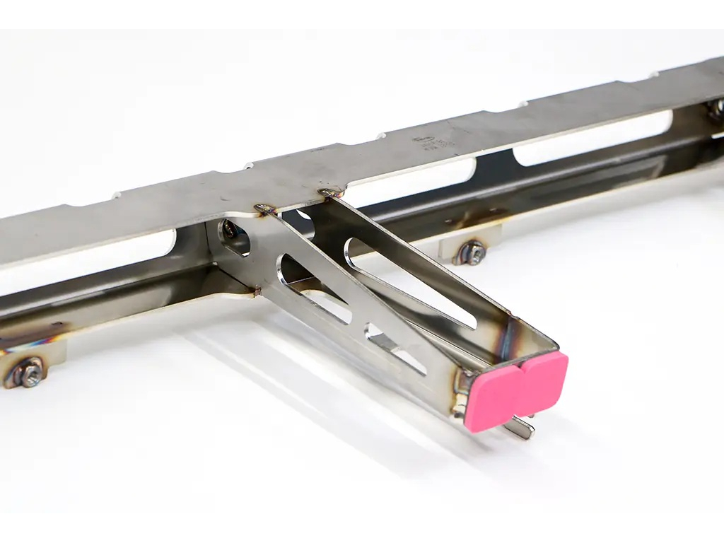 Le montage est conçu pour être simple et sécurisé, avec des supports en acier inoxydable fixés sur les points d'origine, sans perçage. Une entretoise spécifique située à l'avant renforce la structure et améliore la résistance globale de l'ensemble en cas d'impact.