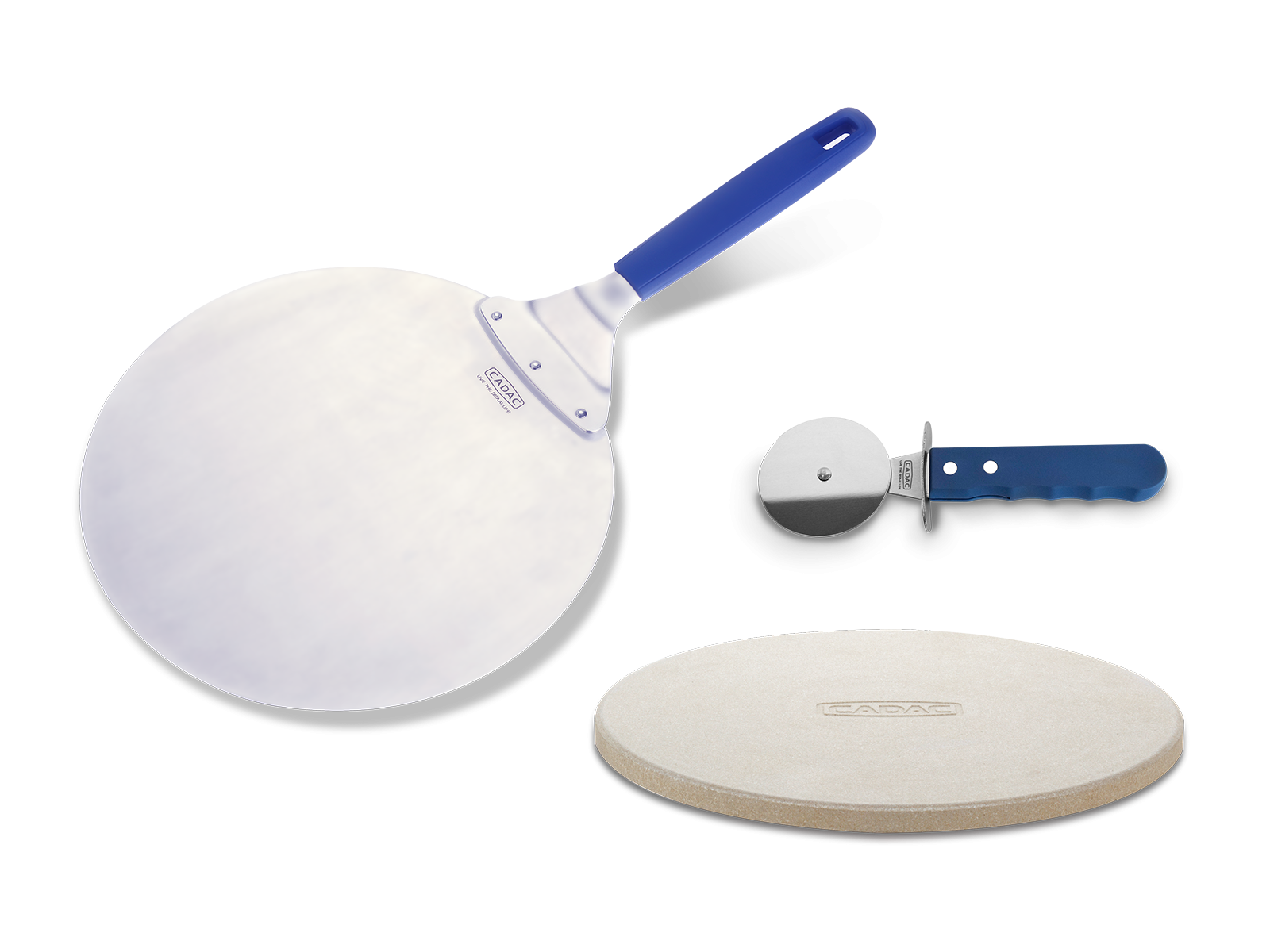Contenu du set : pierre à pizza, pelle à pizza, roulette coupe-pizza