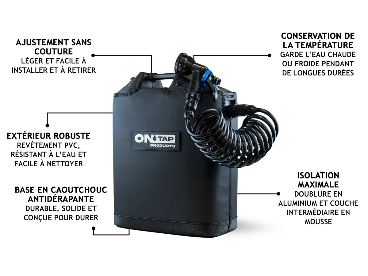 Optimisez l'autonomie de votre équipement outdoor avec la housse isotherme ONTAP, conçue spécifiquement pour la douche portable ONTAP. Que vous soyez en pleine session surf ou en bivouac 4x4, cette housse maintient votre eau chaude ou froide plus longtemps, offrant un véritable confort après l'effort. Sa conception légère et sa mise en place rapide en font un accessoire utile pour toutes vos aventures offroad, Vanlife ou camping sauvage.