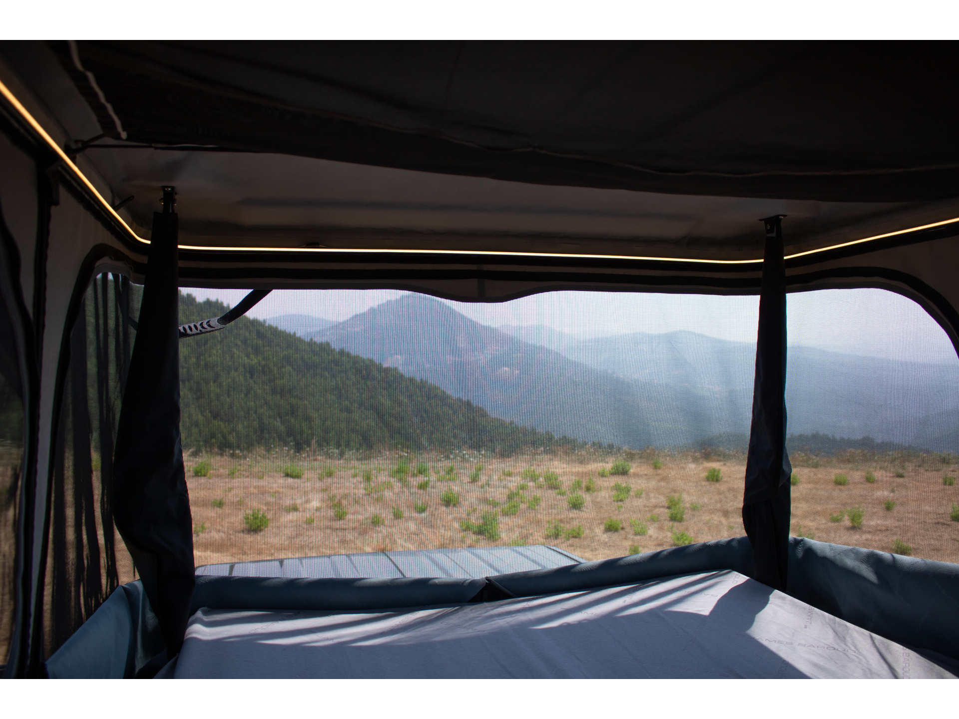 La tente est livrée de série avec une échelle télescopique, un matelas haute densité de 65 mm, un ventilateur solaire silencieux (VMC), des poches intérieures, une barre lumineuse LED ainsi que des supports pour traverses.