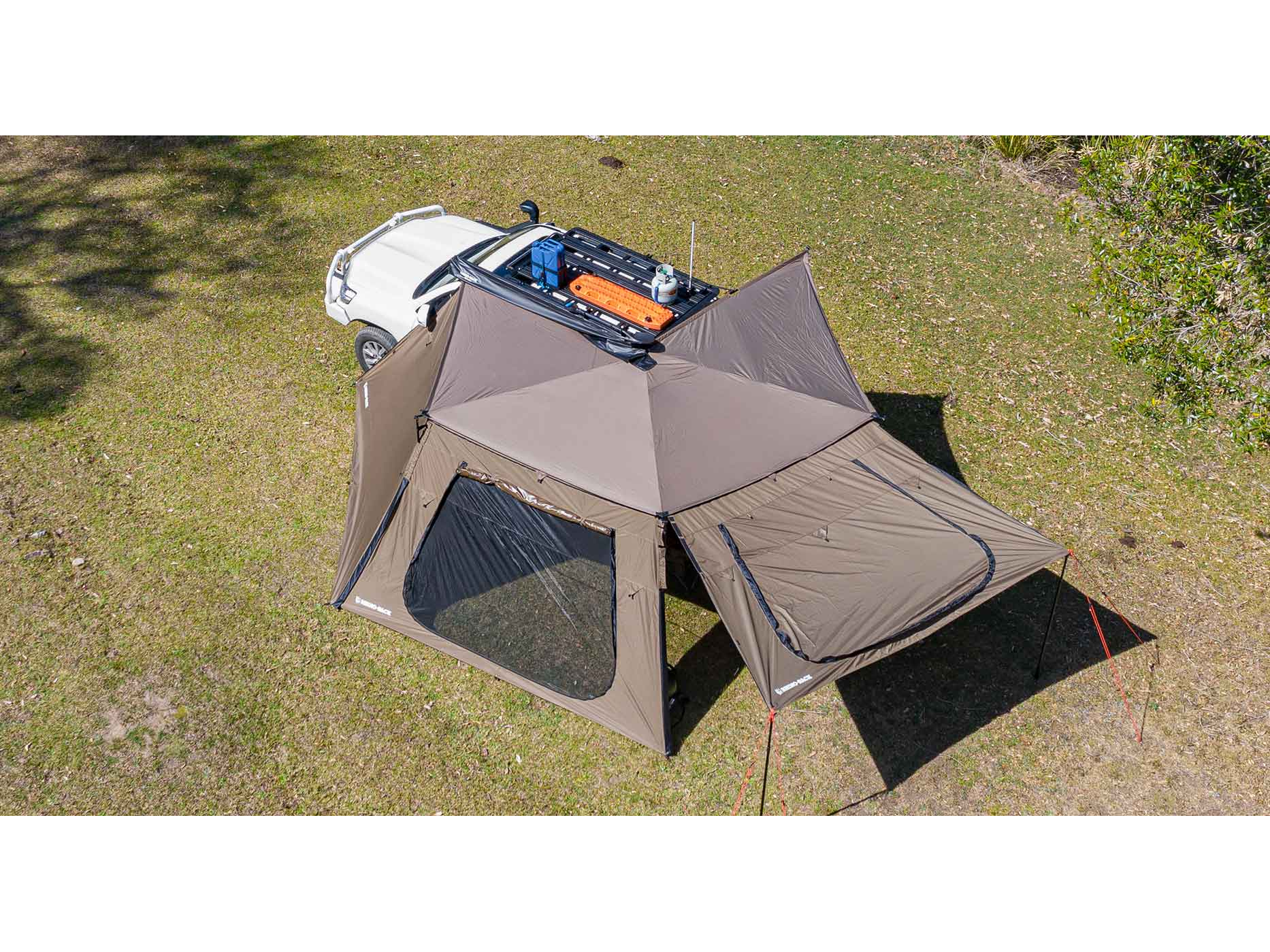 La nouvelle paroi latérale trapézoïdale zippée Rhino-Rack Batwing avec porte s'attache aux auvents Batwing, qu'ils soient du côté gauche ou droit, permettant ainsi de fermer complètement ou partiellement